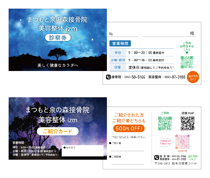 診察券・ご紹介カード-まつもと泉の森接骨院 美容整体izm様 2024年10月1日 ホーム 制作実績 診察券・ご紹介カード-まつもと泉の森接骨院 美容整体izm様 お客様 まつもと泉の森接骨院 美容整体izm 様 商 品 診察券・ご紹介カード 担 当 小澤 制 作 髙田 memo – – デザインイメージをPDFデータで頂き、当社でデザインの調整を行い、印刷・納品しました。 制作実績 カードブランド・広告アイテム 前の記事 次の記事